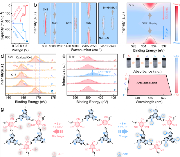 异位光谱研究表明,三噻吩/三氰基作为TN-COF正极的电活性中心,分别与CF3SO3和NH4+电荷载体配位,引发稳定快速的18 e电荷存储过程。这项研究工作为通过分子HOMO/LUMO能级策略设计高电压-容量有机正极材料提供了新的视角。