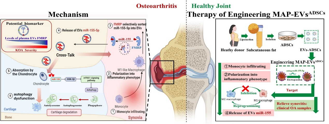 该研究的意义不仅在于揭示了OA早期骨髓MNs源外泌体(EVs)整合性驱动KOA病理进展的分子机制,证实了精准靶向炎性MNs的工程化外泌体载药装置在临床OA样本的显著功效,同时发现OA早期诊断的潜在靶点:血浆外泌体FMRP蛋白,为骨关节炎的生物医学诊疗提供全新的诊疗靶点和技术。