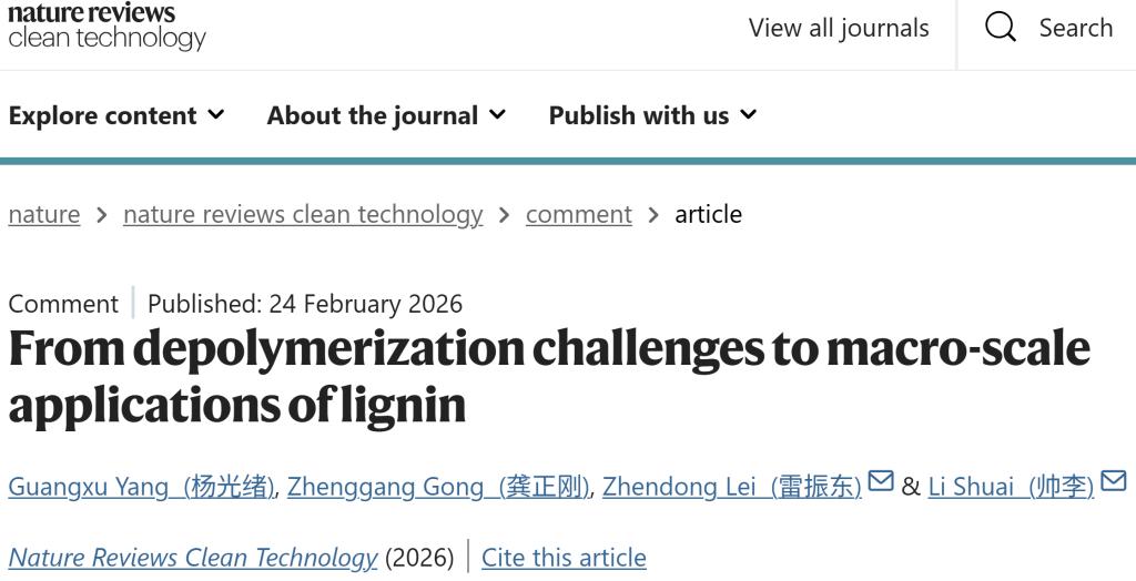 近日,《自然综述:清洁技术》(Nature Reviews Clean Technology)在线发表了环境科学与工程学院雷振东教授团队题为“From depolymerization challenges to macro-scale applications of lignin”的评述论文。论文系统梳理了木质素从解聚挑战到宏观规模应用的发展脉络与关键瓶颈,并创新性提出“材料中心”策略,为破解木质素规模化、低碳、高值化利用难题提供了新思路。