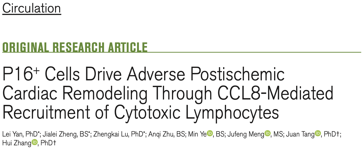 心肌梗死后,心脏会经历由炎症、细胞死亡和纤维化瘢痕形成等驱动的不良重塑,最终导致心力衰竭。然而,驱动过程中的细胞和分子机制一直未被完全阐明。近日,同济大学生命科学与技术学院唐娟教授团队与上海科技大学生命科学与技术学院张辉教授团队联合在《循环》(Circulation)杂志上发表突破性研究,首次系统揭示P16阳性细胞在心脏不良重塑中的关键作用,并提出了靶向CCL8信号或P16阳性成纤维细胞的精准干预新策略。