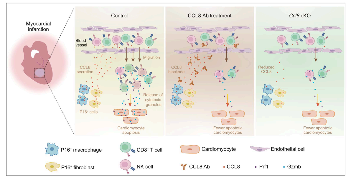 图1.研究示意图:P16阳性细胞通过分泌CCL8招募CD8+ T细胞和自然杀伤(NK)细胞,诱导心肌细胞凋亡,推动心梗后心脏不良重塑