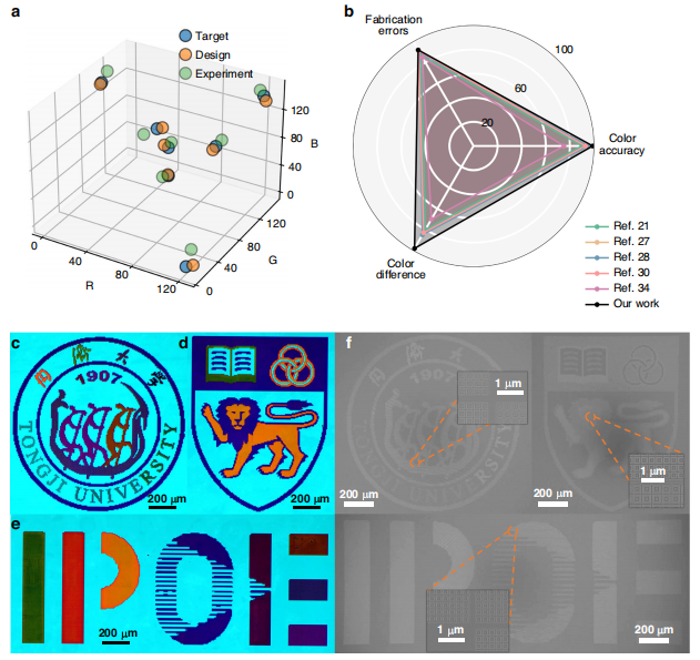 图2、三幅画样品的显微图像:a,九种颜色的RGB值对比;b,颜色精度、色差与制备误差的综合对比;c,同济大学;d,新加坡国立大学;e,同济大学精密光学工程技术研究所三所机构徽标的实验观测光学图像;f,三个样品的扫描电子显微镜图像。