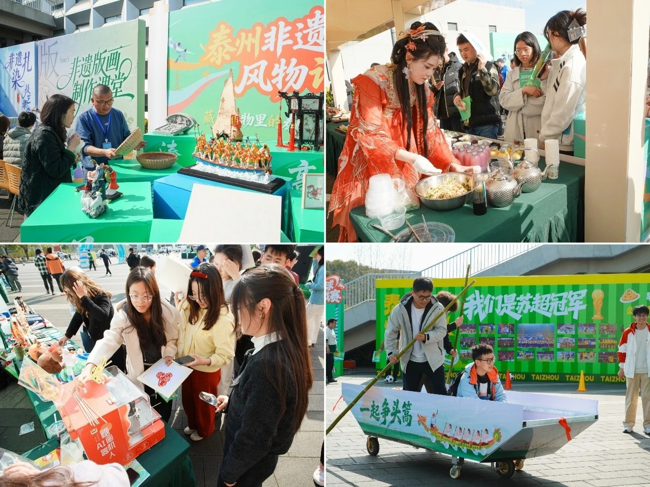 泰州早茶、溱湖八鲜、非遗文创、趣味互动……人才引力场现场气氛热烈欢腾,从舌尖到指尖,从观赏到参与,在泰州潮玩局,同学们一站式沉浸体验了泰州的特色魅力。
