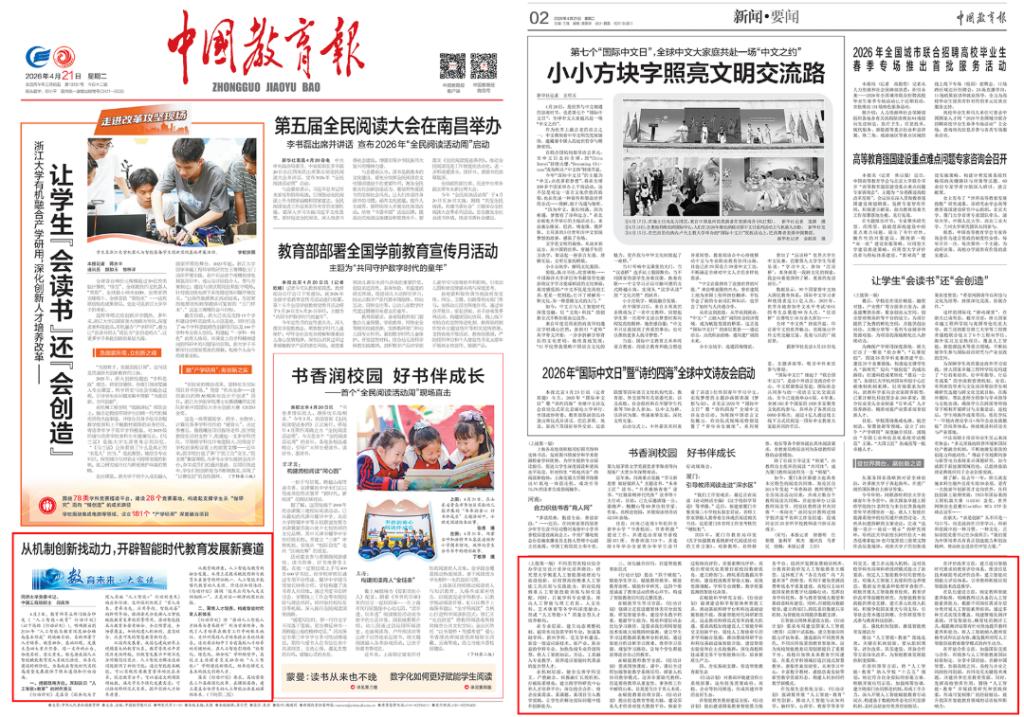 4月21日,《中国教育报》头版刊发同济大学党委书记、中国工程院院士郑庆华的署名文章《从机制创新找动力,开辟智能时代教育发展新赛道》,对近日教育部等五部门联合印发的《“人工智能+教育”行动计划》进行全面解读。
