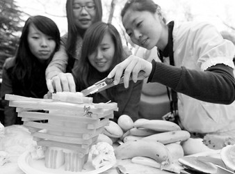 日前,同济大学的学生在校园里举行了一场别开生面的“世博场馆搭建比赛”,同学们利用各种水果蔬菜搭建出上海世博会的各个场馆。