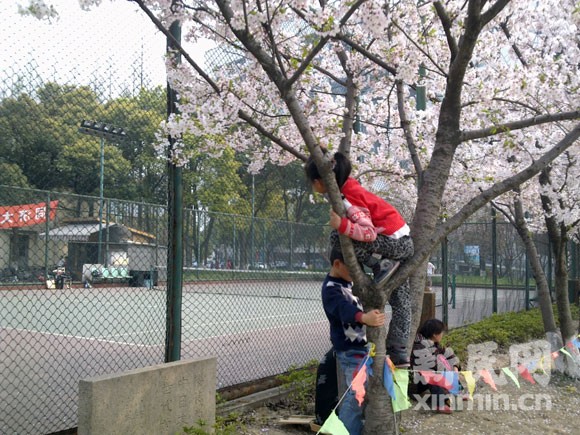 有些调皮的小孩子爬到了樱花树上 新民网记者 袁蓉 摄