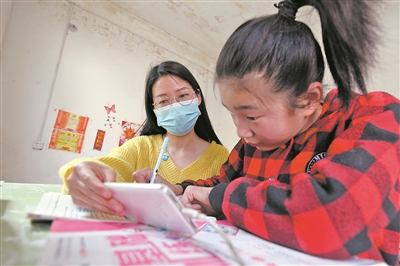 马婷婷(左)正在辅导村民子女上网课。庞珂 摄