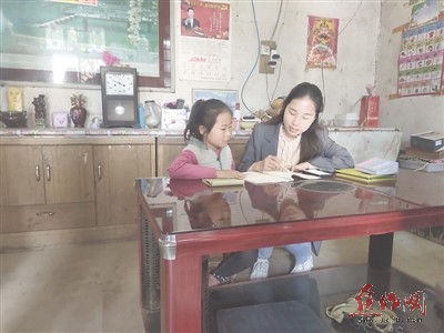 “两个黄鹂鸣翠柳,一行白鹭上青天……”4月27日,在贫困户王彦领家,马姣姣在帮助她的二女儿学习。而在院子里,大学生王志灵正在教王彦领大女儿做手工。