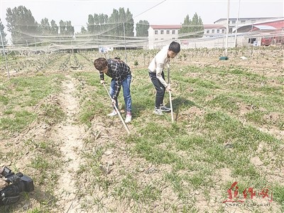 赵文赐(左)、秦润潮在无花果基地除草。