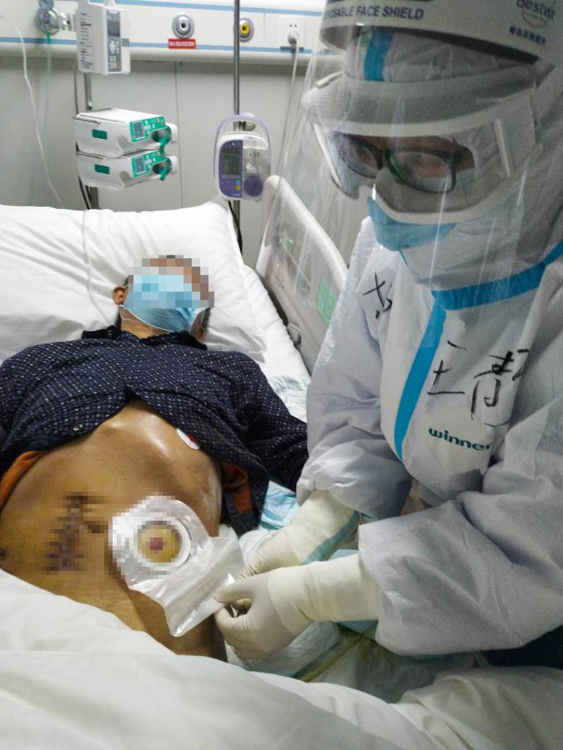 王静最多一天进出了三个病房,给7位病人清理造口。“当最后一次出污染区,脱换防护服的时候,我腿都已经抬不起来,全身是汗。”