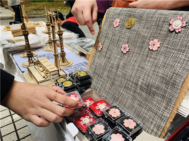 此外,明信片、徽章、地图等原创周边、纯手工首饰、山水花鸟石头画、刀笔油画和大学生的歌声、舞蹈,共同点亮这个集市的青春色彩。据悉,短暂休整两天后,樱花集市将在本周五继续开张。