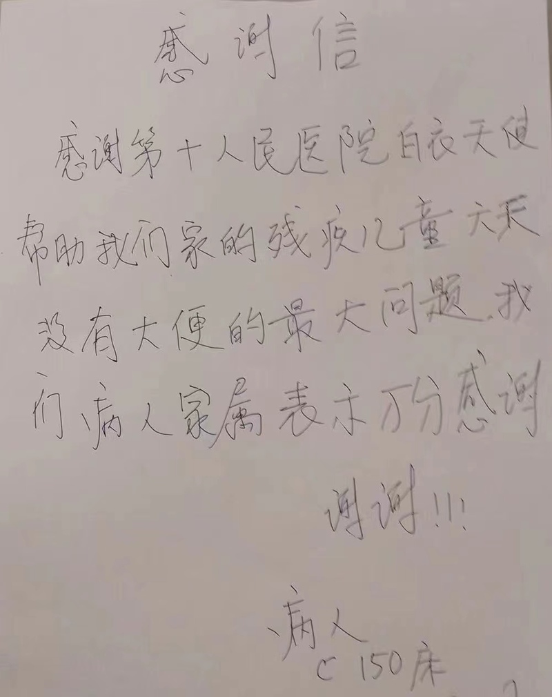 “感谢白衣天使帮助我们家的残疾儿童解决6天没有大便的问题。”近日,上海市民何先生在罗泾京东方舱医院里写下了质朴的感谢信。在这家方舱医院,同济大学附属第十人民医院的医生接诊了他的儿子轩轩,这个11岁男孩患有自闭症,一直伴有严重的便秘。与感染新冠病毒的父母一起入住方舱后,病毒感染加上饮食、环境的改变,让他的便秘愈发严重。