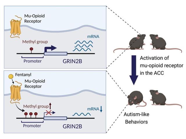 该研究通过动物实验模拟对幼儿多次麻醉手术过程中使用阿片类镇痛药芬太尼的过程,发现芬太尼能通过激活mu阿片受体引起幼年小鼠大脑前扣带皮层(ACC)中N-甲基-D-天冬氨酸受体(NMDAR)的亚基Grin2b基因启动子区高甲基化,导致其mRNA和蛋白表达下调,最终造成新生小鼠远期出现自闭症样行为。