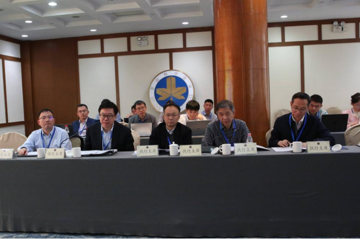 执行主席江俊、谢在库、李景虹、王坚和杨金龙(前排从左至右)在主持会议。香山科学会议办公室供图