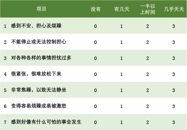 问卷由个体根据本人近2周的情况填写。表格中的数字为本项目的得分。7项得分累加超过或等于10分,就提示受测试者存在较显著的焦虑情绪,应该寻求专业帮助。