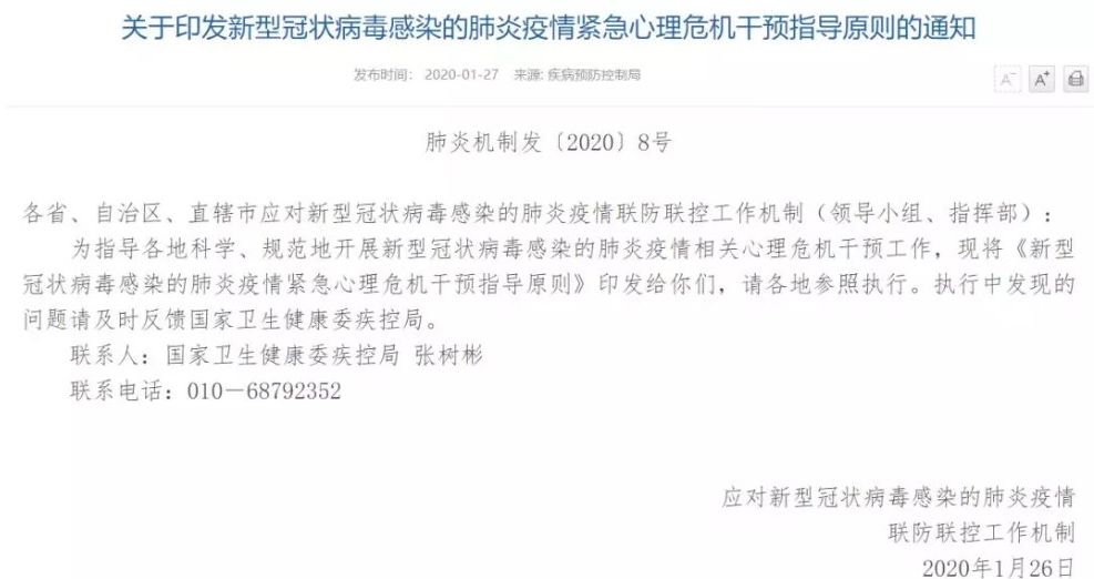 1月27日,国家卫生健康委员会网站发布《新型冠状病毒感染的肺炎疫情紧急心理危机干预指导原则》,旨在指导各地科学、规范地开展新型冠状病毒感染的肺炎疫情相关心理危机干预工作。