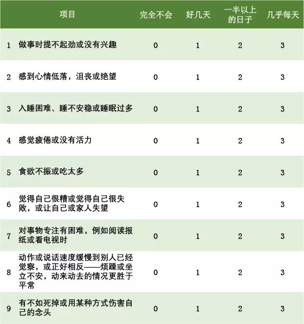 问卷由个体根据本人近2周的情况填写。表格中的数字为本项目的得分。9项得分累加超过或等于10分,就提示受测试者存在较显著的抑郁情绪,应该寻求专业帮助。