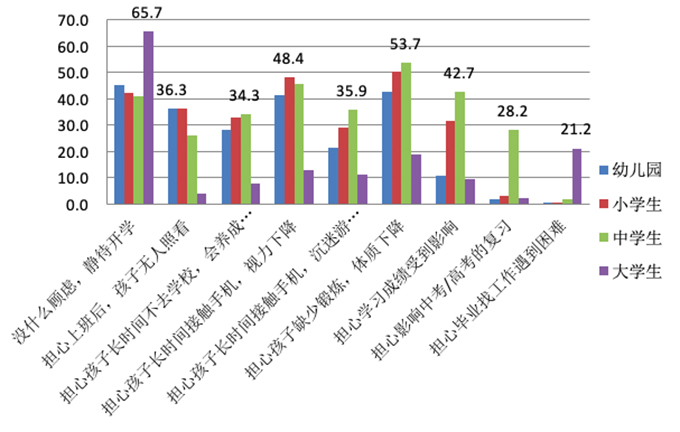 对于不同学龄段的家长而言,顾虑的问题或有侧重。对于幼儿园(学前阶段)的家长而言,除了担心孩子体质和视力下降之外,在父母上班后,孩子的照看问题则更为突出,对孩子的习惯养成、是否沉迷网络和学习成绩等方面的担忧略低于小学生和中学生家长。