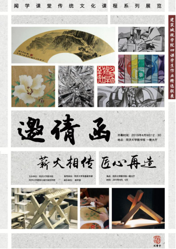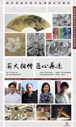 2019年4月9日,由同济大学党委宣传部指导,同济大学图书馆、同济大学建筑城规学院主办,闻学堂承办的以“薪火相传 匠心再造”为主题的建筑城规学院四课学生作业精选联展,将展示《中国传统绘画工笔技法》《中国传统家具与文化》《篆刻艺术》《艺术造型》等既与中国文化紧密相连又充满新时代创新特点的系列课程学生作业和模型,展期安排如下: