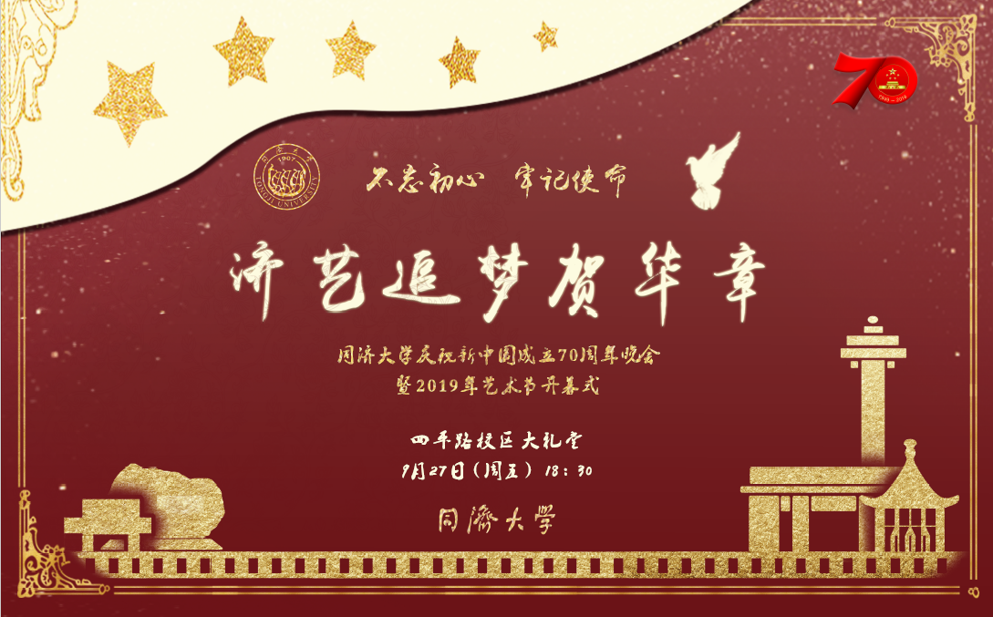为庆祝新中国成立70周年,进一步学习贯彻习近平新时代中国特色社会主义思想,深化“不忘初心、牢记使命”主题教育,全面贯彻落实立德树人根本任务,加强新生艺术教育,“济艺追梦贺华章”同济大学庆祝新中国成立70周年晚会暨2019年艺术节开幕式即将上演。