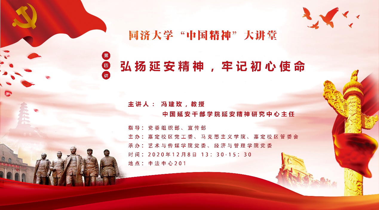 同济大学“中国精神”大讲堂第四讲将于12月8日13时30分在四平路校区中法中心201开讲,特邀中国延安干部学院延安精神研究中心主任冯建玫教授主讲“弘扬延安精神,牢记初心使命”。