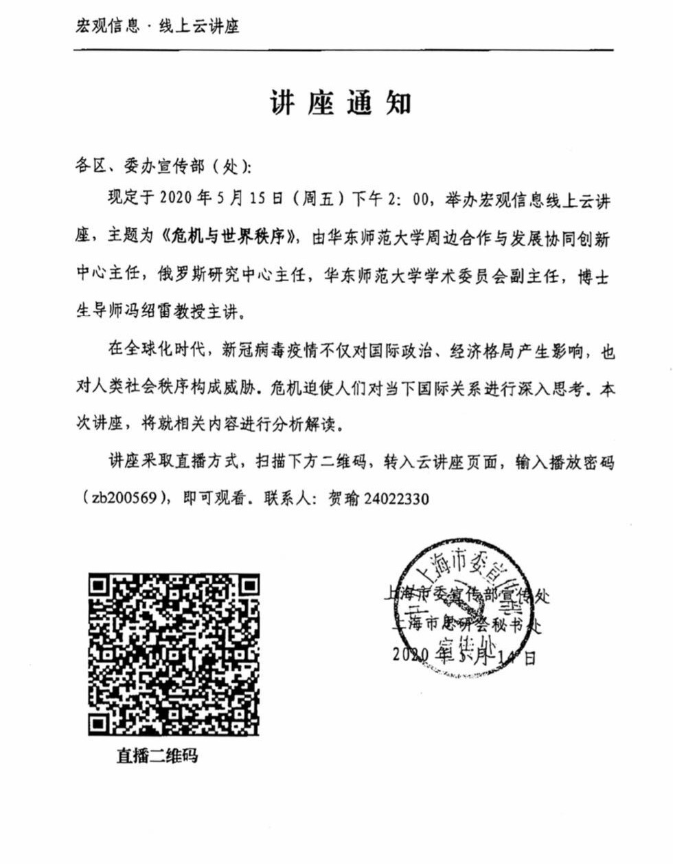 (5月15日14:00)“云”讲座通知:华东师范大学周边合作与发展协同创新中心主任、俄罗斯研究中心主任冯绍雷教授主讲《危机与世界秩序》