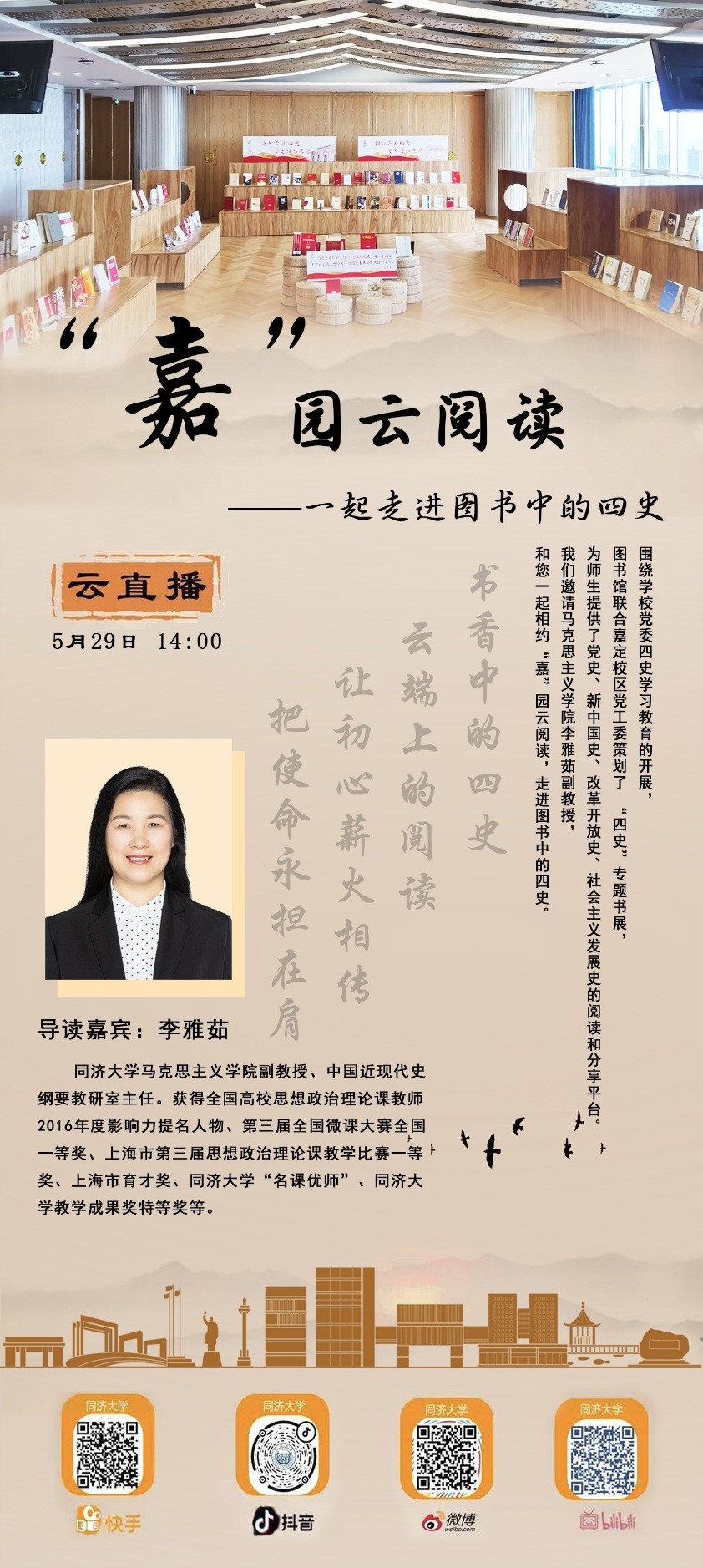 围绕学校党委四史学习教育的开展,图书馆联合嘉定校区党工委策划了 “以史鉴今 资政育人——同济大学图书馆‘四史’专题书展”,通过从图书馆馆藏中精心挑选的一百四十多册四史相关书籍,布置了一个线下阅读和线上推广相结合的“四史阅读”空间,为师生提供了党史、新中国史、改革开放史、社会主义发展史的阅读和分享平台。5月29日,我们邀请马克思主义学院李雅茹副教授为我们做四史专题书籍的导读,和您一起相约“嘉”园云阅读,走进图书中的四史。