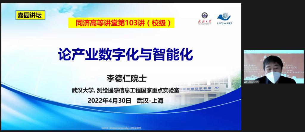 为了丰富在校师生的文化生活,嘉园讲坛特别推出五一特辑系列讲座。4月30日下午,首场讲座“论产业数字化与智能化”在线举行,李德仁院士作了题为《论产业数字化与智能化》的讲座。讲座由副校长童小华主持,750余人在线聆听了讲座。