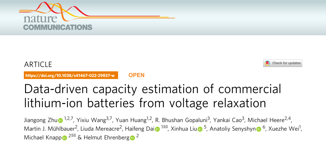 4月27日,《自然·通讯》(Nature Communications)在线发表了题为“Data-driven capacity estimation of commercial lithium-ion batteries from voltage relaxation”的研究论文。该研究由同济大学汽车学院魏学...