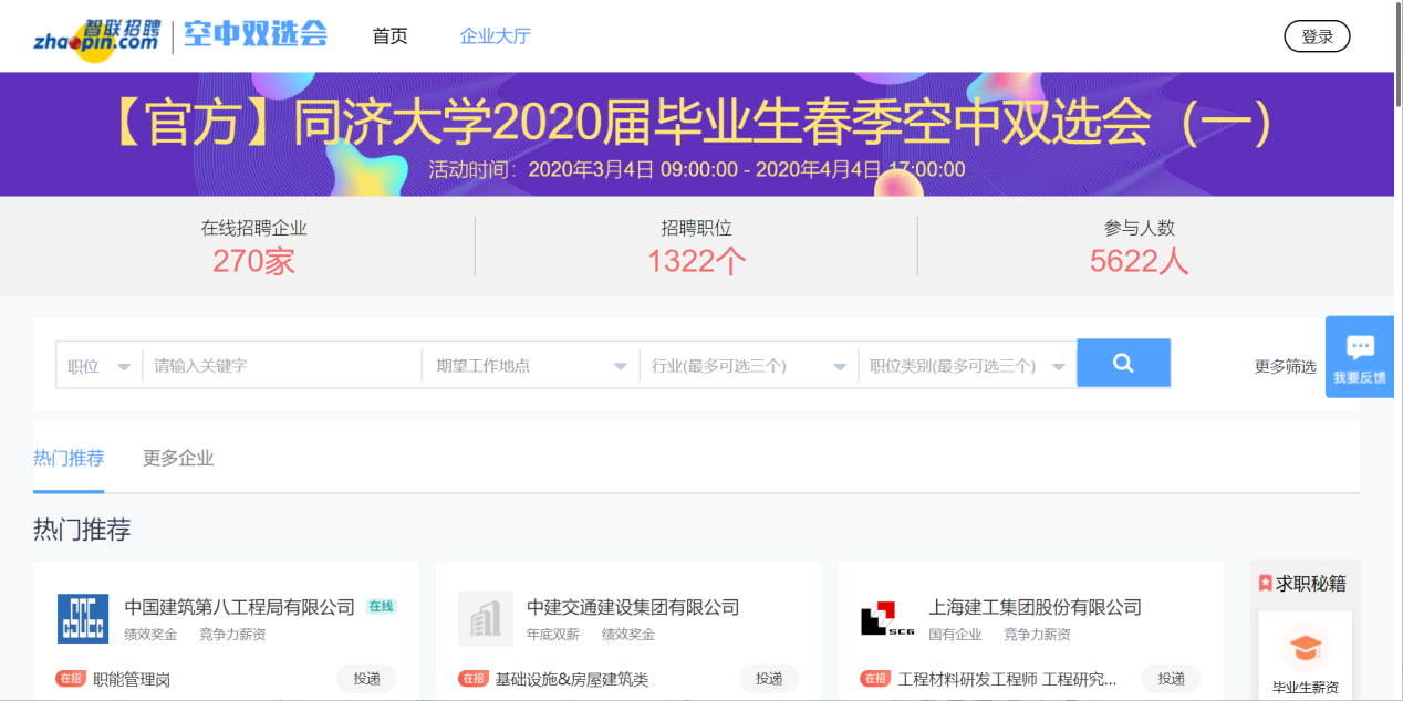 同济大学2020年首场空中双选会上线一周,岗位需求25000+